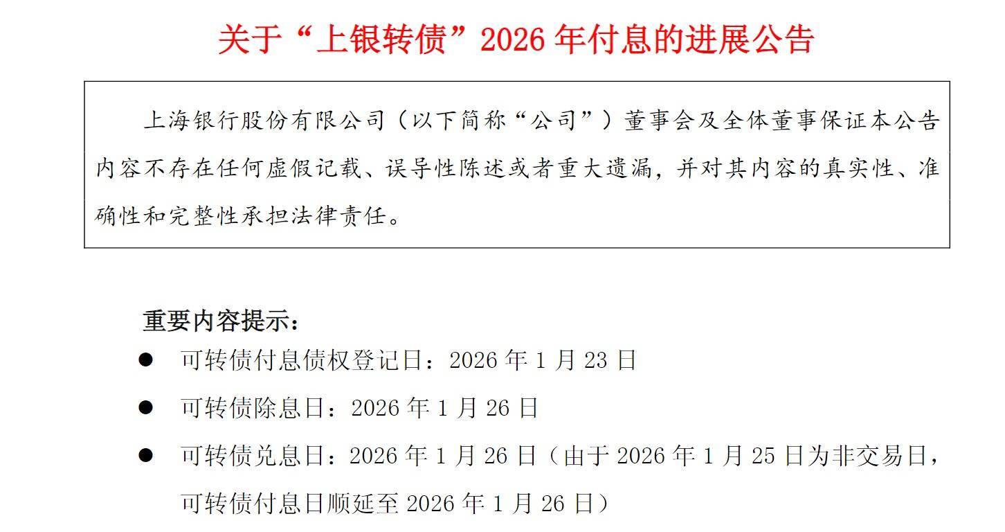 近日,上海银行(601229.SH)发布公告,披露其2021年发行的200亿元A股可转换公司债券(简称“上银转债”,代码:113042)付息安排,本次付息将于2026年1月26日正式实施,惠及全体合格持有人。
