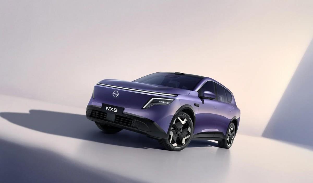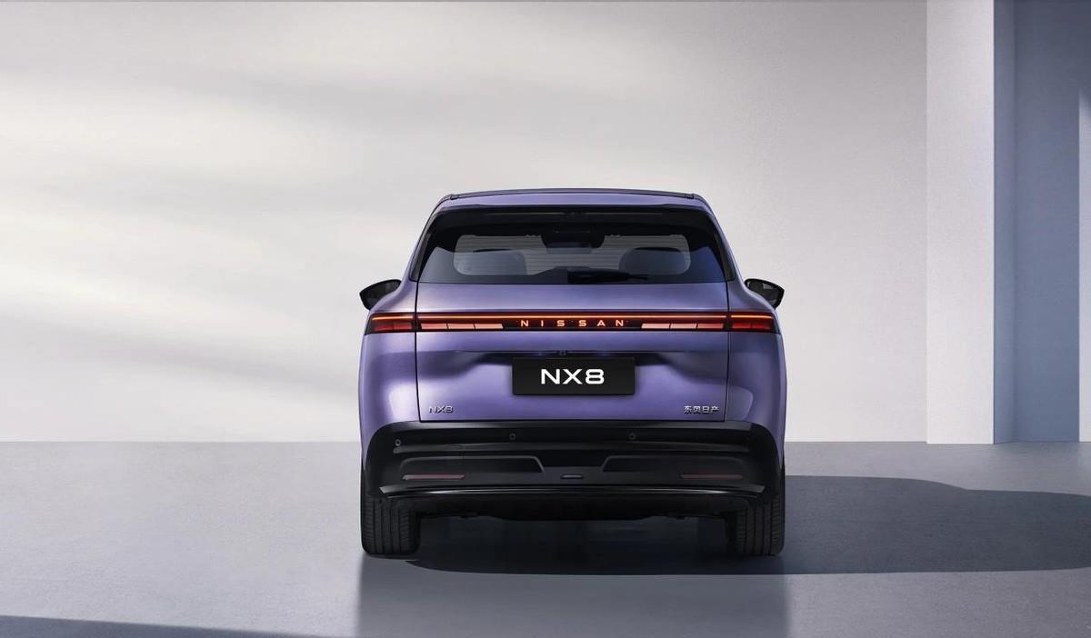 第四台:日产NX8,定位5座纯电/增程双动力中大型SUV,采用日产家族化简约设计,配备隐藏式门把手;车身尺寸4870/1920/1680mm,轴距2917mm;