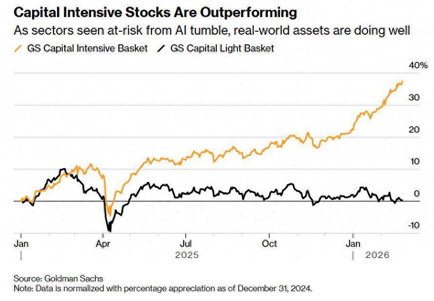 正如上图所显示的那样,重型资本密集型股票正在显著跑赢市场,当被视为面临“AI颠覆风险”的软件等轻资产板块大幅下挫之际,现实世界资产表现良好。以上数据以2024年12月31日为基准,按百分比涨幅进行标准化处理。