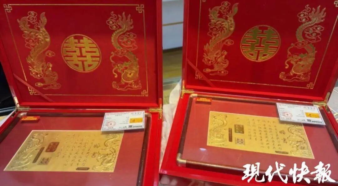 4月8日,国际金价涨到4800美元/盎司,国内实时金价突破1060元/克,品牌金饰报价涨超1400元/克。高金价背景下,现代快报记者走访南京黄金市场发现,一种轻克重、重寓意的“黄金婚书”正走俏婚庆市场。