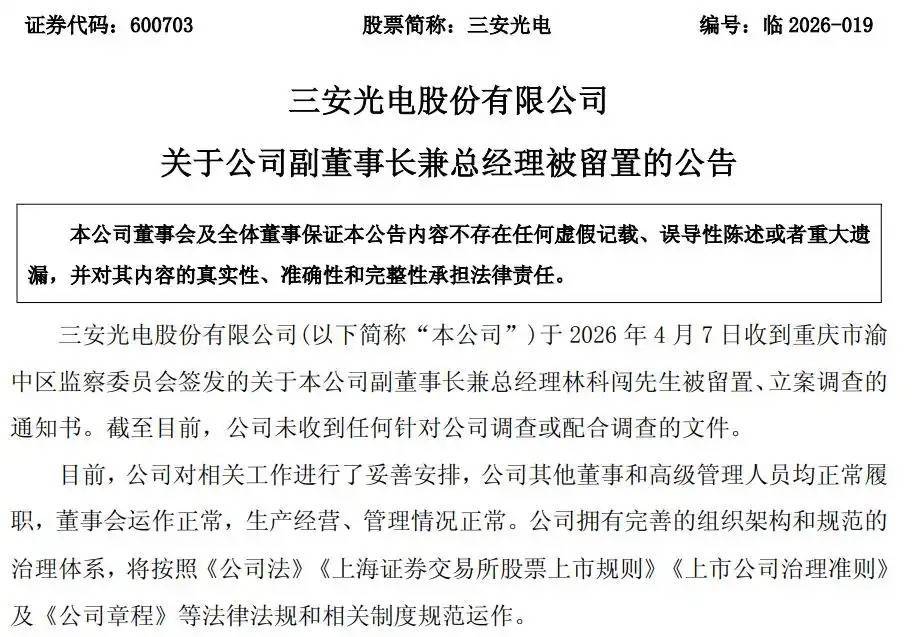 三安光电近期迎来了“多事之秋”。继实控人林秀成不久前被留置之后,4月8日晚间,三安光电(600703)公告,公司于2026年4月7日收到重庆市渝中区监察委员会签发的关于本公司副董事长兼总经理林科闯被留置、立案调查的通知书。而公开信息显示,林科闯是林秀成的女婿。