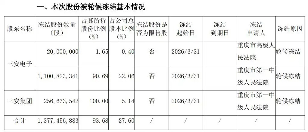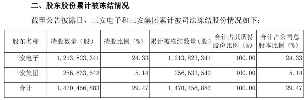 截至公告披露日,三安电子和三安集团累计被司法冻结14.7亿股,占其所持股份的100%、公司总股本的29.47%。