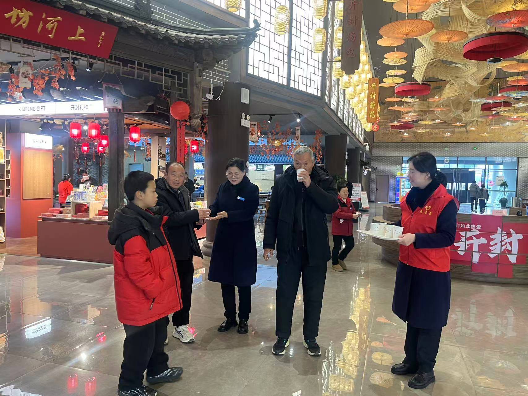 在G30连霍高速开封“宋文化”主题服务区,工作人员为过往司乘人员送上暖心姜茶。(受访者供图)服务区还新增“宋式祈福墙”“活字印刷体验区”,邀请民间艺人现场展演。为了让返乡游子、途经司乘人员沉浸式感受当地文化魅力,河南高速融合洛阳牡丹文化、信阳茶文化等元素,同步升级5对特色服务区。